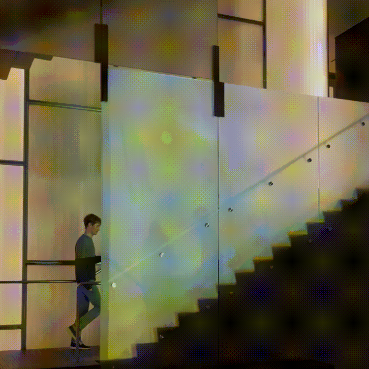 In the group exhibition Through the Looking Glass, I created an art installation - In The Sun Walk where I reimagined the experience of walking up the stairs by transforming the glass of a static stairwell into an immersive, interactive space that continuously changes with its environment and participants.