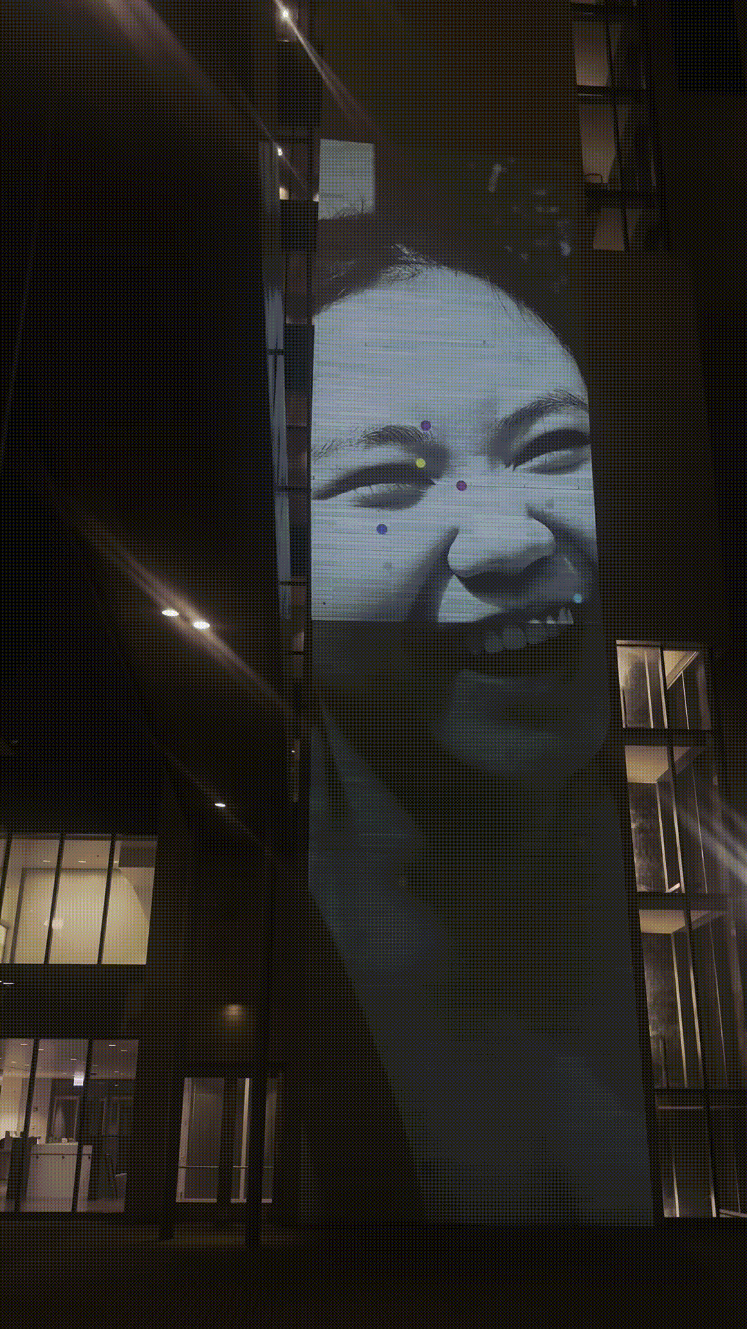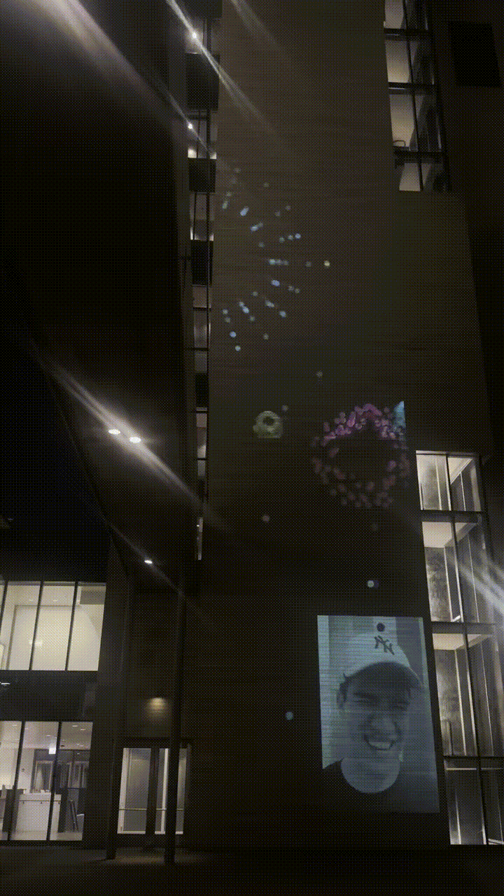 Everyone has a unique laughter, yet all of them has the common power to spread joy. Laughter is contagious. So are fireworks.They both have the magic to bring people together. Inspired by this energy that unites us all, I coded a sound-reactive firework display that ignites with laughter and curated it into a firework show. Projected onto an eight-story building, this interactive show transformed laughter and joy into something visible. As each individual appears and fireworks lit up the night, smiles are spread through the crowd and into the air!