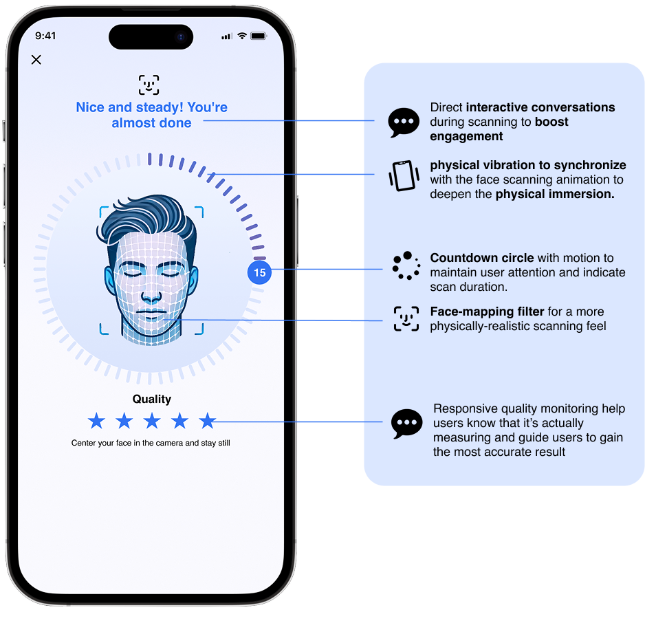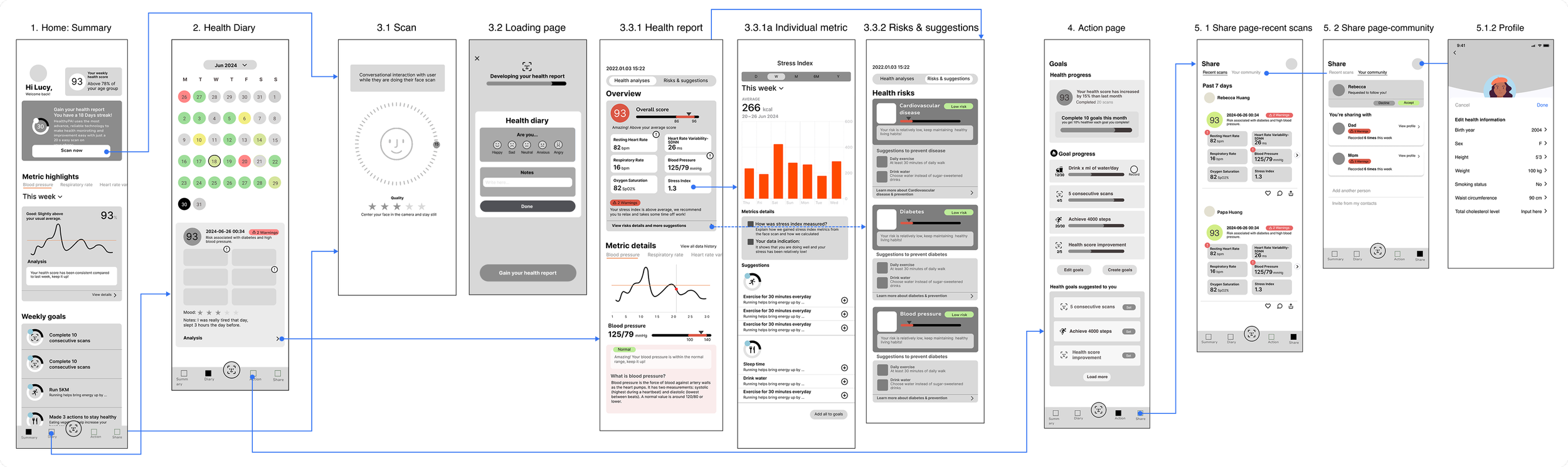 Key improvements includes placing a prominent face-scan button on the landing page to encourage health scans and optimizing the dashboard to display clear, actionable health metrics alongside consistent calls to action.