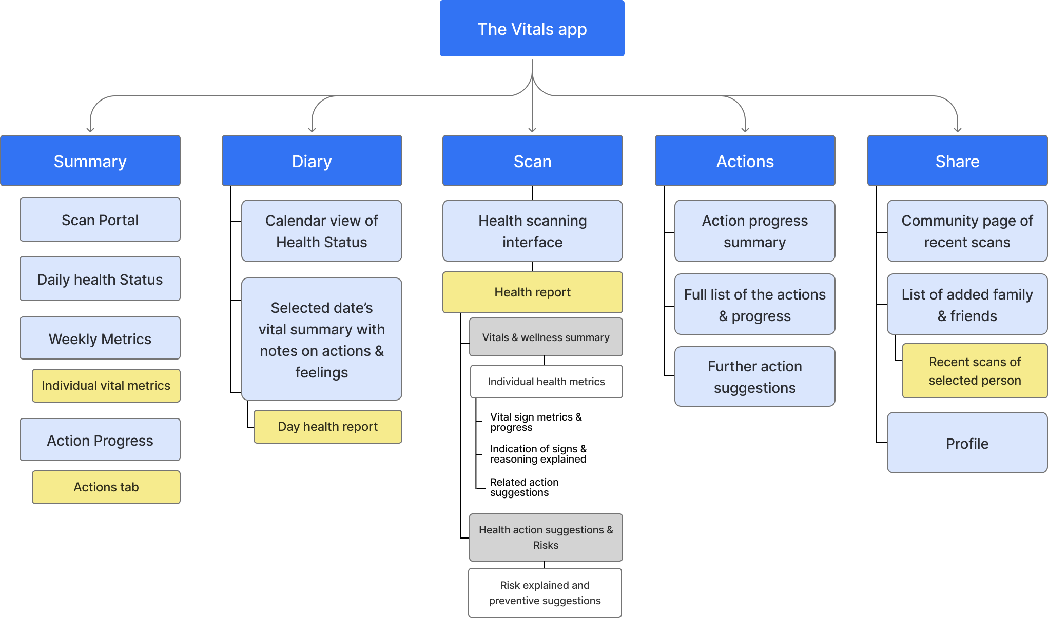 After competitive research and clarifying my goals, I gained a clear idea of the main components of the app. I created a user flow map that lays out the structure, feature and content involved in each component, which was later further optimized to ensure objective of the app is achieved.
