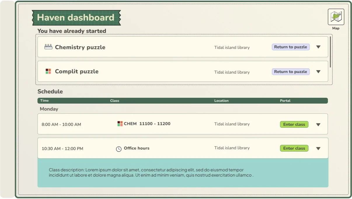 As a solution, I transformed the planner into a Dashboard, enabling new features such as quickly accessing old puzzles and improved clarity to differentiate puzzles and office hours through icons and additional information.